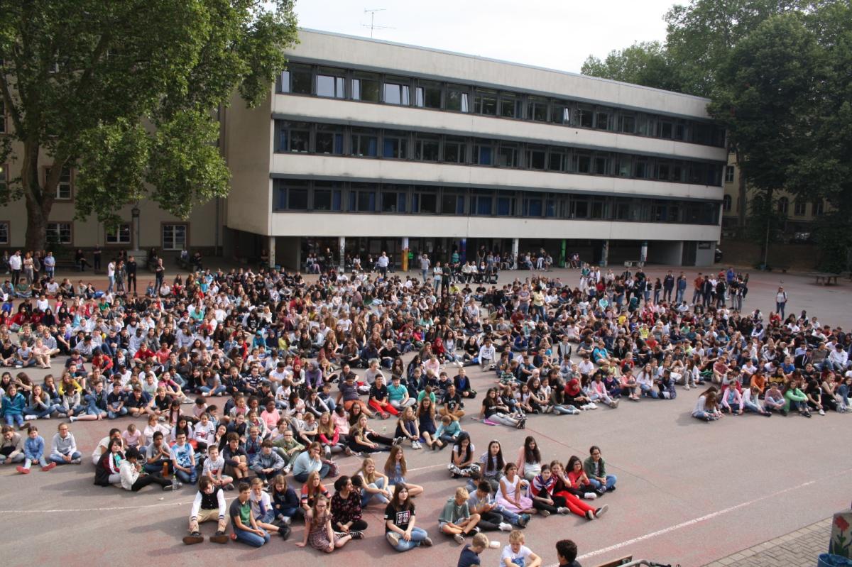Traditionell versammelten sich – wider Erwarten bei strahlendem Landfermann-Wetter – Schülerschaft und Lehrerschaft am letzten Schultag des Schuljahres 2018-2019 auf dem Schulhof, um die wichtigsten Veränderungen und Perspektiven von der Schulleitung zu erfahren. Verabschiedet wurden Frau Küppers und Herr Langheim. Frau Windhues und Frau Auras sind für ein ganzes bzw. ein halbes Jahr nicht in der Schule. Ein letztes Mal wurden Aula und Sporthalle im aktuellen Zustand wahrgenommen, bevor jetzt ein Jahr gebaut wird – und nachher alles viel schöner sein wird, wir sind gespannt.