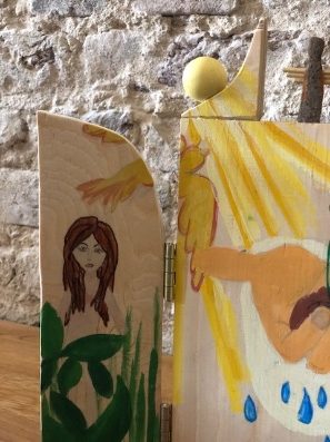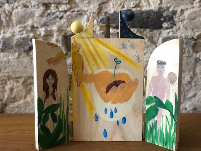 Den Abschluss der Reihe bildete die Aufgabe, ein modernes Triptychon zu gestalten. Was das ist? Das hatten die 5er schnell heraus: Ein „Klapp-Altar“, der sowohl im offenen als auch im geschlossenen Zustand ein Altarbild ergibt.