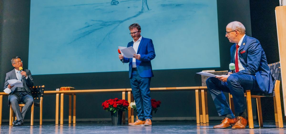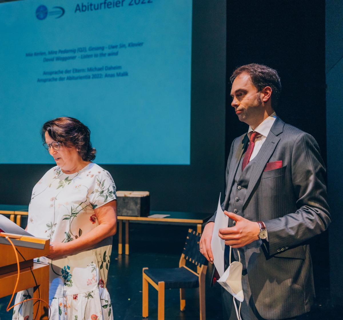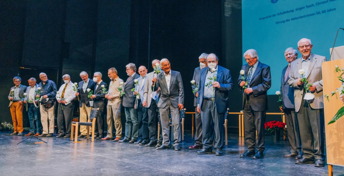 In der Abiturfeier im Stadttheater spielten Herr Sin, Herr Tasch und Herr Haering als Rückblick auf manchen Haken in der Corona-Zeit den ersten Aufzug aus Becketts “Warten auf Godot”, nur verändert zu “Warten auf Gebau(Französisch als Geboh gesprochen)(er) … und verabschiedeten so auch Herrn Tasch und begrüßten Herrn Sinn als neuen Stellvertreter. Anas Malik sprach die Schülerrede, Herr Daheim die Elternrede – und außerdem konnten wir endlich wieder unsere Altabiturientia von gleich 3 Jahrgängen – die ältesten vom Abiturjahrgang 1960 (!) feiern! Und es gab sehr schöne Musik…. und besondere Würdigungen (Die Certilingua-Auszeichnungen von Mia Lösken und Klara Neumann müssen wir noch nachreichen – herzlichen Glückwunsch an dieser Stelle!)