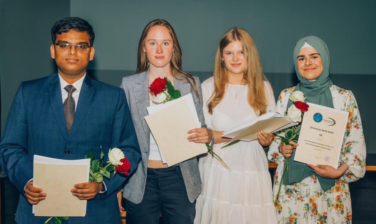 Wir haben insgesamt 106 Schüler*innen (die bestanden haben), nicht zugelassen wurde 1 Schüler:in, 1 Schüler hat leider nicht bestanden, hat aber die Fachhochschulreife. Der Abi-Durchschnitt ist 2,47 – ein insgesamt gutes Ergebnis – und es hat ganz tolle Ergebnisse gegeben: Achtmal die 1,0: 36 Schüler*innen mit einer “1” vor dem Komma – und am besten sind: Harsh Singhal mit einer Gesamtpunktzahl von 883, – Klara Neumann mit einer Gesamtpunktzahl von 864, Anna Butz mit 859 Punkten und Sümmeyye Aydin mit 851 Punkten. Besonders gefreut haben wir uns über 5 Seiteneinsteiger-Schüler:innen, die das Abitur bestanden haben; am beeindruckendsten war die Rede von Toqa Ahmad auf dem Abiball in Ratingen. Und gefreut haben wir uns auch, wie viele Schüler:innen es am Ende dann – nach zum Teil 3 “Existenzprüfungen” – doch noch geschafft haben!