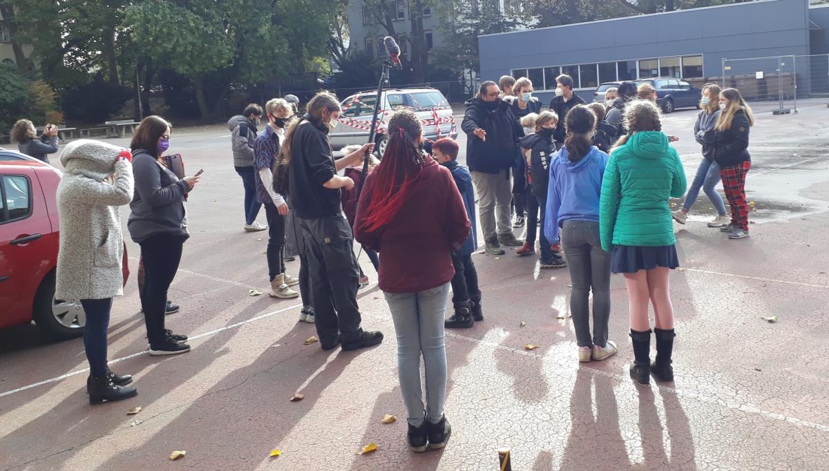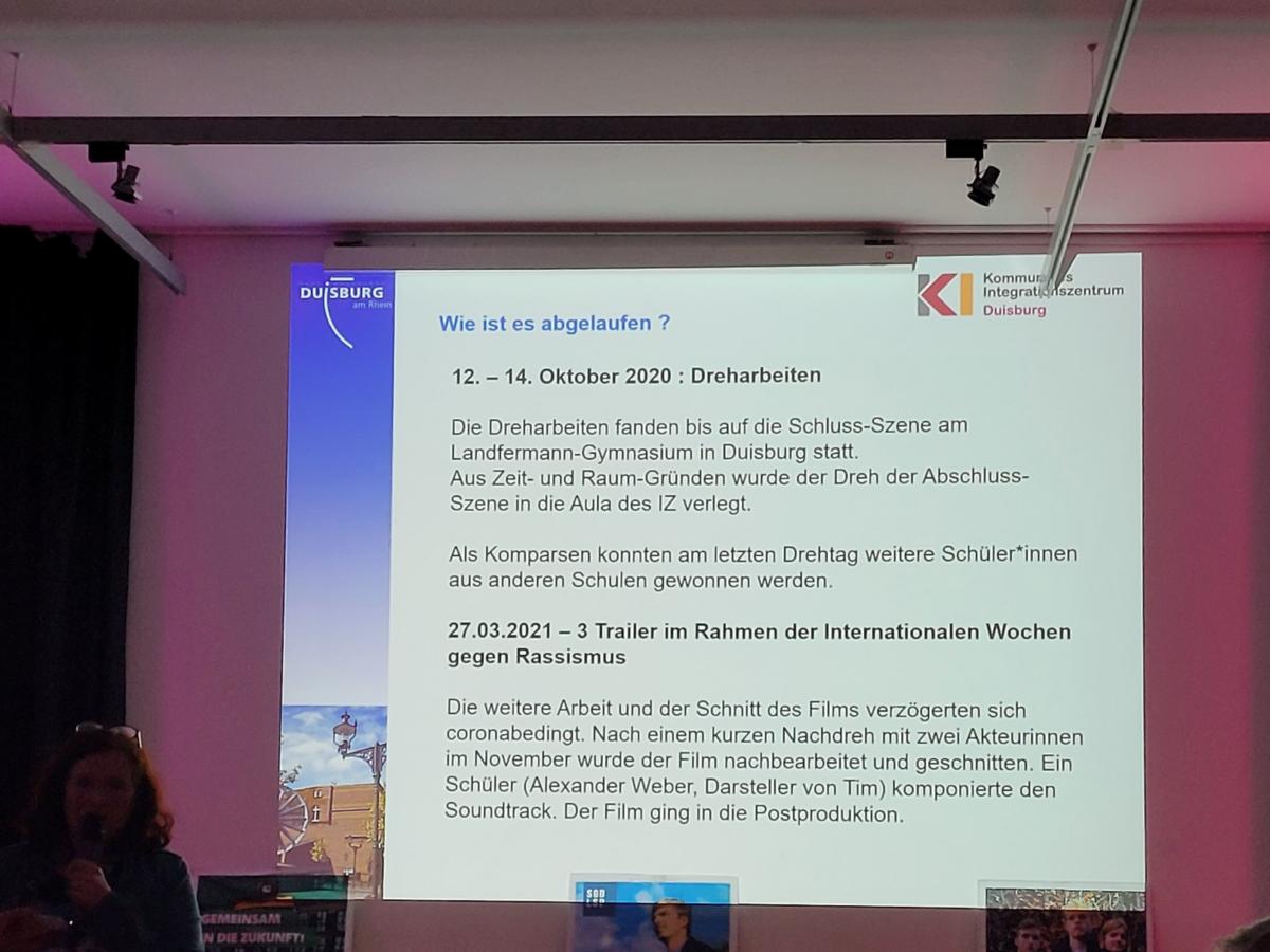 Und in den Herbstferien 2020 – unter schwierigen Rahmenbedingungen – hat die Stadt Duisburg, kordiniert von Frau Rombeck, zusammen mit dem Duisburger Regisseur Cem Arslan einen richtigen Film im Rahmen des Courage-Projektes gedreht – mit Schüler*innen Duisburger Schulen als Schauspieler*innen – darunter auch Ex-und aktuellen Landfermann-Schüler*innen  – und zwar an und rund um unsere Schule … die aber im Film natürlich anders heißt.