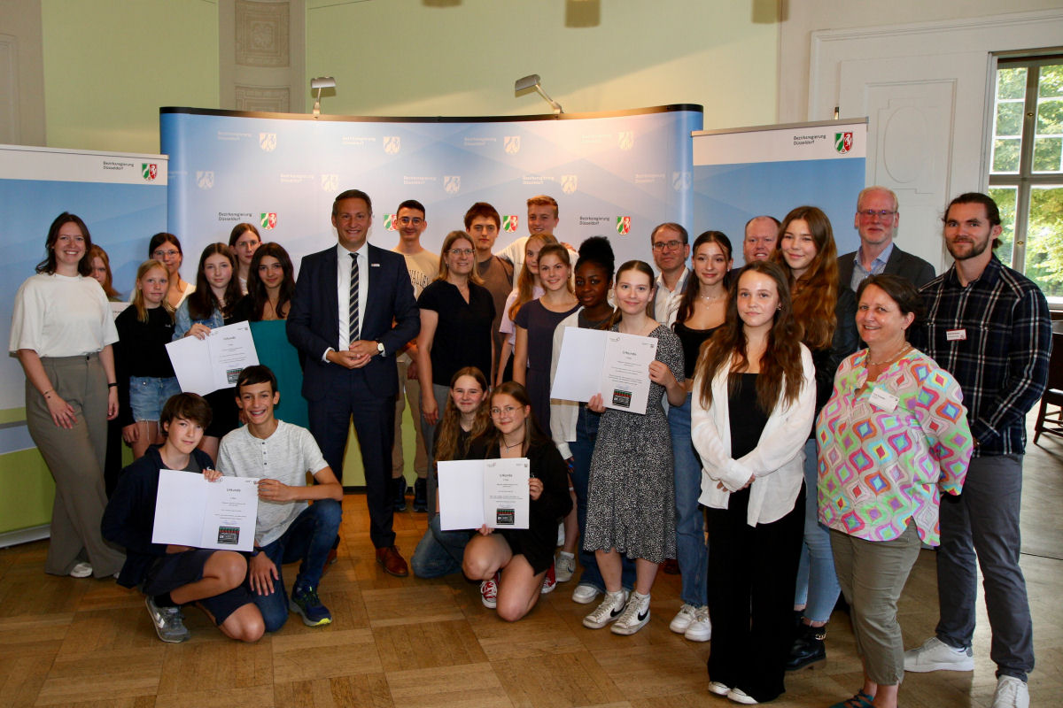 Das Landfermann-Gymnasium gehörte zu den fünf prämierten Schulen, die am 14.8.2023 in Anwesenheit von Herrn Regierungspräsident Schürmann aus den Händen von LRSD Teuber im Festsaal der Bezirksregierungsgebäudes an der Cecilienstraße in Düsseldorf zwei Siegerpreise entgegennehmen durften.