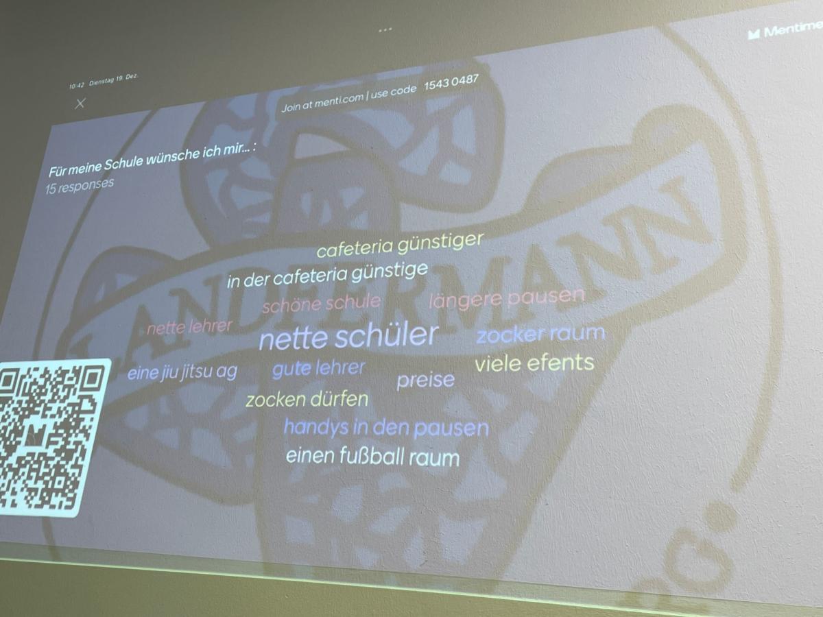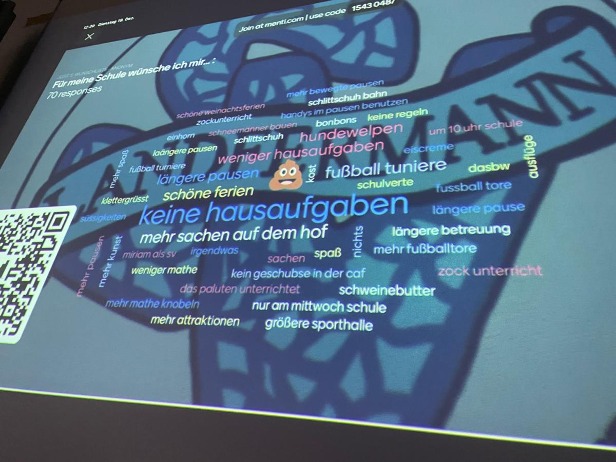 Auch unsere Fünftlässler blieben nicht vergessen und haben von der Vorweihnachtszeit profitieren können, da sich die Schülervertretung etwas spannendes für sie überlegt hatte: Als erstes hatten wir einen glanzvollen musikalischen Eintritt in die Klassen und die Fünftklässler haben kräftig mitgesungen, sodass wir uns direkt bekanntgemacht haben. Wir haben das Vorwissen zur Arbeit der Schülervertretung der Fünftklässler durch von uns erstellten Kahoot-Quizzes getestet und weitergebildet und wir konnten Ihnen die Kernmerkmale unserer SV spielerisch näher bringen. Darauf folgte noch eine WordCloud, die durch die Wünsche der Schüler*innen und Schüler selbst entstand.