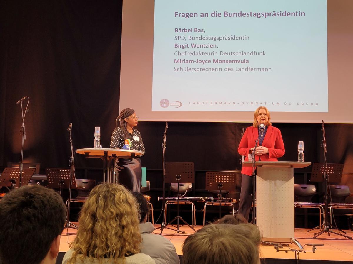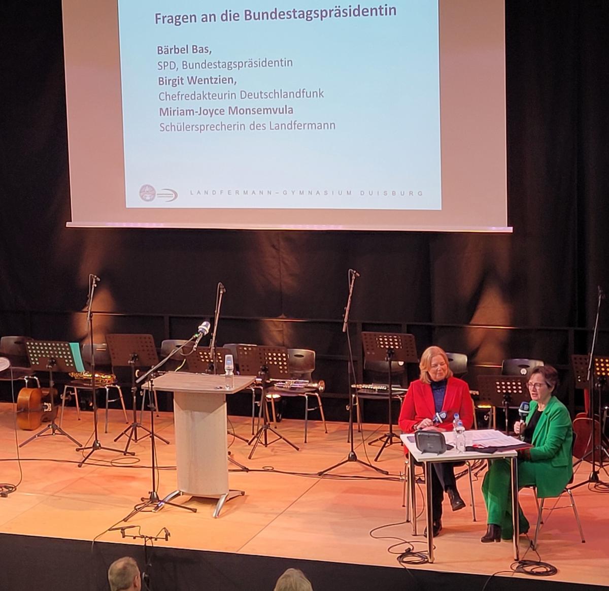 Am Donnerstag, dem 15.2.2024 kommt die Präsidentin des Bundestags – und unsere Duisburger Abgeordnete Bärbel Bas zu uns, Miriam-Joyce Monsemvula und die SV hatten sie eingeladen. Außerdem gibt es eine Podiumsdiskussion u.a. mit Lamya Kaddor – wir freuen uns sehr auf diesen “politischen Donnerstag” in unserer Aula.