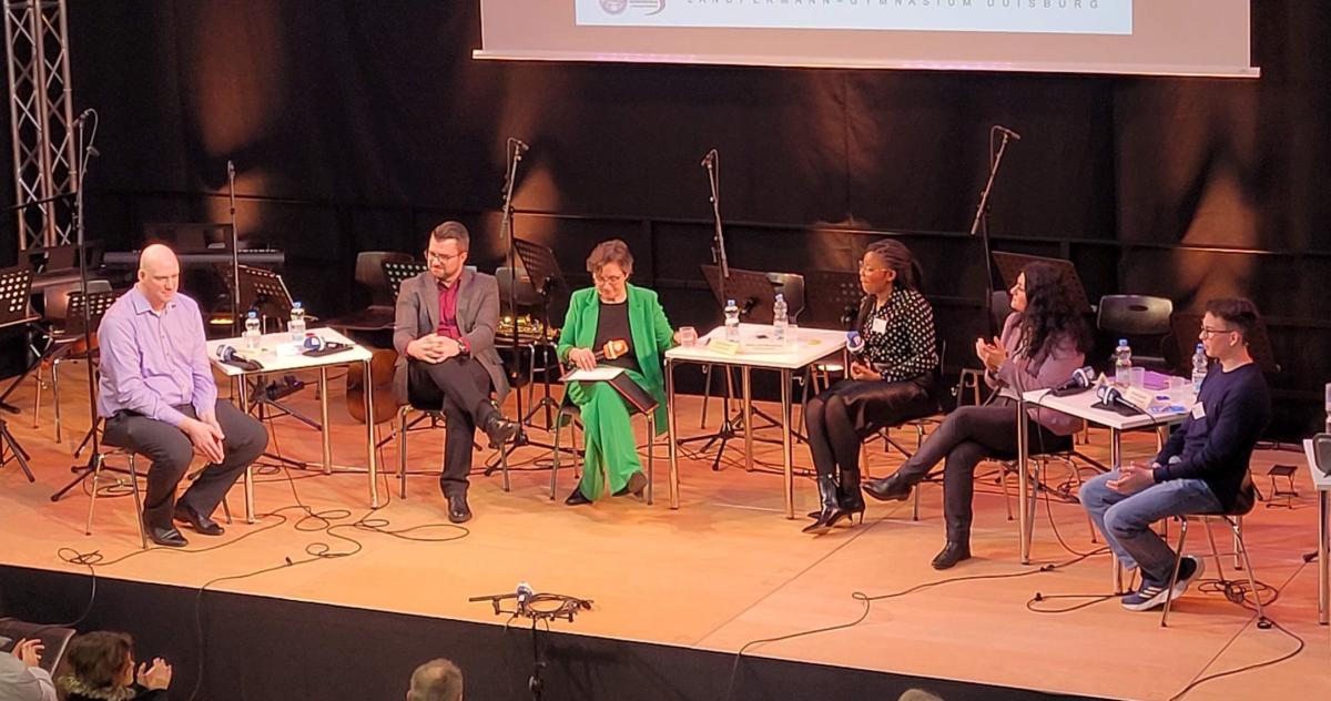 Es war wirklich sehr interessant – und es hat alles gut geklappt: Unsere Schüler*innen waren toll, auch die Zuhörer*innen, die Organisation durch Herrn Bukowski und Herrn Strackbein, Herrn Druschke und Herrn Spolders, dem Schulorchester mit Herrn Stockey – und ganz besonders unsere Schülersprecher*innen Ismail Chaib, Florian Gallhoff und Miriam-Joyce Monsemvula als tolle Moderatorin.