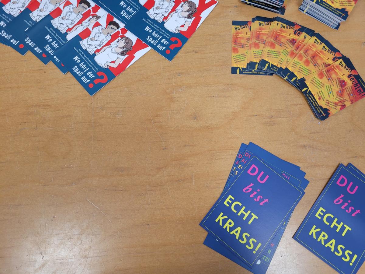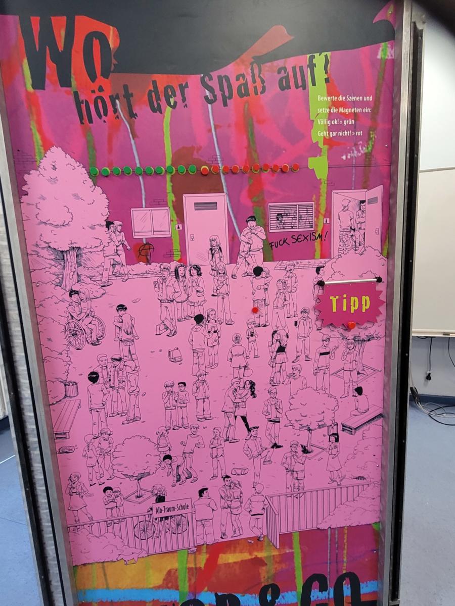 In den nächsten Tagen werden alle 8. und 9. Klassen die interaktive Ausstellung ECHT KRASS zur Prävention sexueller Übergriffe unter Jugendlichen besuchen. An 5 Lernstationen werden sich die Jugendlichen mit Aspekten von Sexismus, sexueller Gewalt und Schutzrechten auseinandersetzen. Spielerisch trainieren sie im animierenden Mitmachparcours, sexuelle Grenzverletzungen wahrzunehmen, Grenzen einzuhalten, sich gegen Übergriffe zu wehren und frühzeitig Hilfe zu holen.