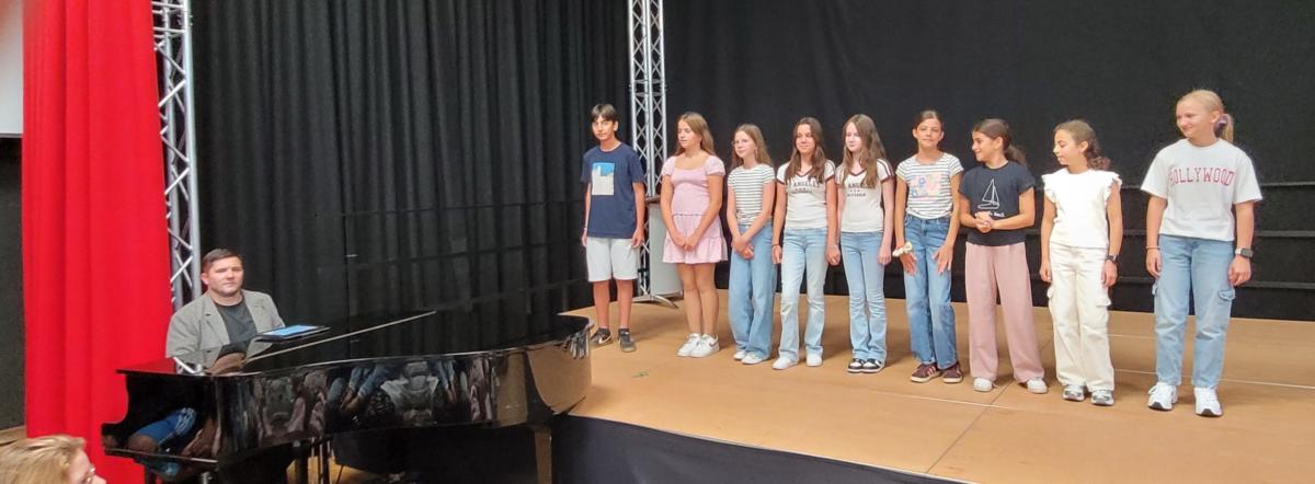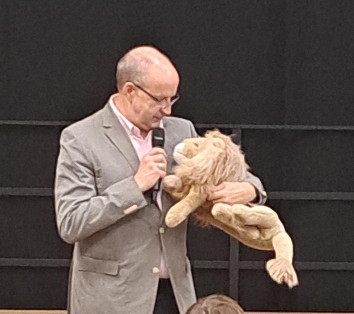 Der ehemalige Neigungskurs Musik sang unter der Leitung von Herrn Stockey; Herr Haering sprach von unseren neuen Schüler*innen als Rosen und Löw*innen, mit Blüten und mit Dornen, geschützt und besonders … und von seinem Löwen Peggy, dem König der Tiere und doch ein Kuscheltier; und von den Veränderungen, die die nächsten Jahre für Schule und Unterricht bringen können.
