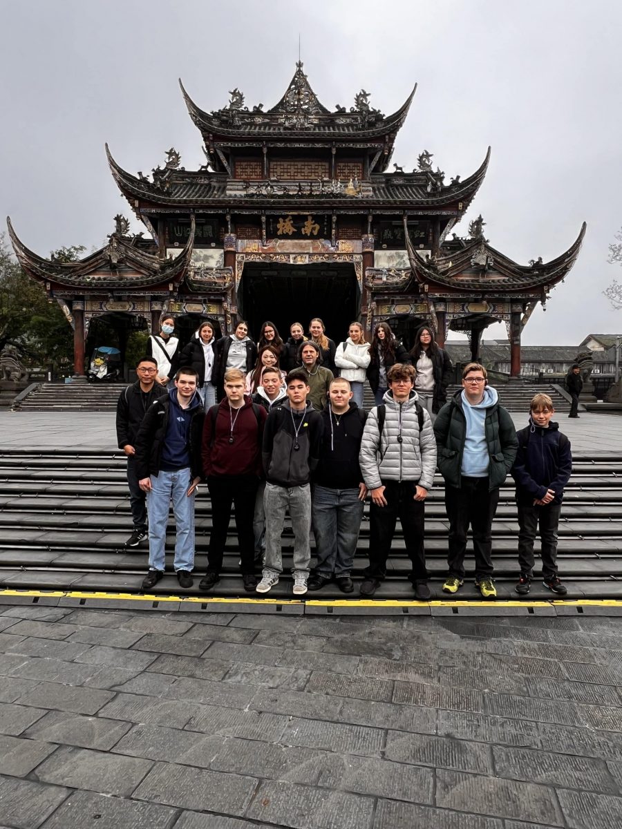 Vom 3. bis 20. November 2025 besuchten sechzehn Schülerinnen und Schüler aus den Stufen 9, EF und Q1 die Experimental Foreign Languages School in Chengdu. Begleitet wurden sie von Herrn Ochoa und Herrn Wachter. Neben dem ungewohnten Essen lernten die Duisburger auch, sich in campusartigen Schule zurecht zu finden. Nach ihrem Aufenthalt in Chengdu besuchten sie auch noch ein Stück der großen Mauer und Peking. In unserem Reisetagebuch schildern die Schüler, was sie im Reich der Mitte alles erlebt haben – zuoberst aber die Fotos. Im nächsten Jahr kommen dann Schüler*innen aus Chengdu zu uns ans Landfermann – wir freuen uns.
