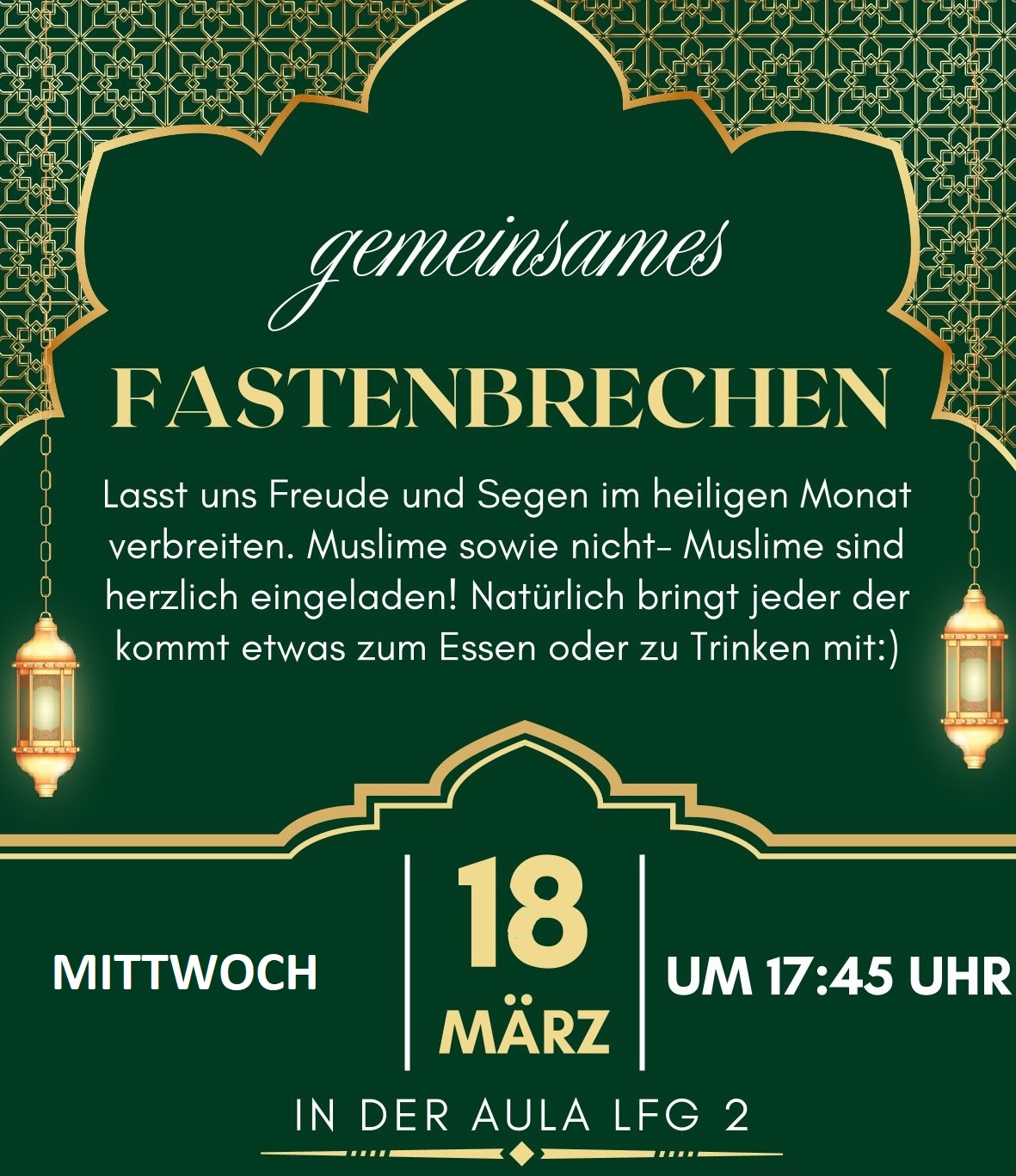 wir laden euch ganz herzlich zum diesjährigen Iftar Abend ein. Als Zeichen der Interkulturalität und Interreligiösität unserer Schule laden wir alle ein, egal welche Religion oder Herkunft. Jeder, der kommt, bringt etwas zu Essen oder Getränke für das gemeinsame Buffet mit. Besteck stellt die SV.
